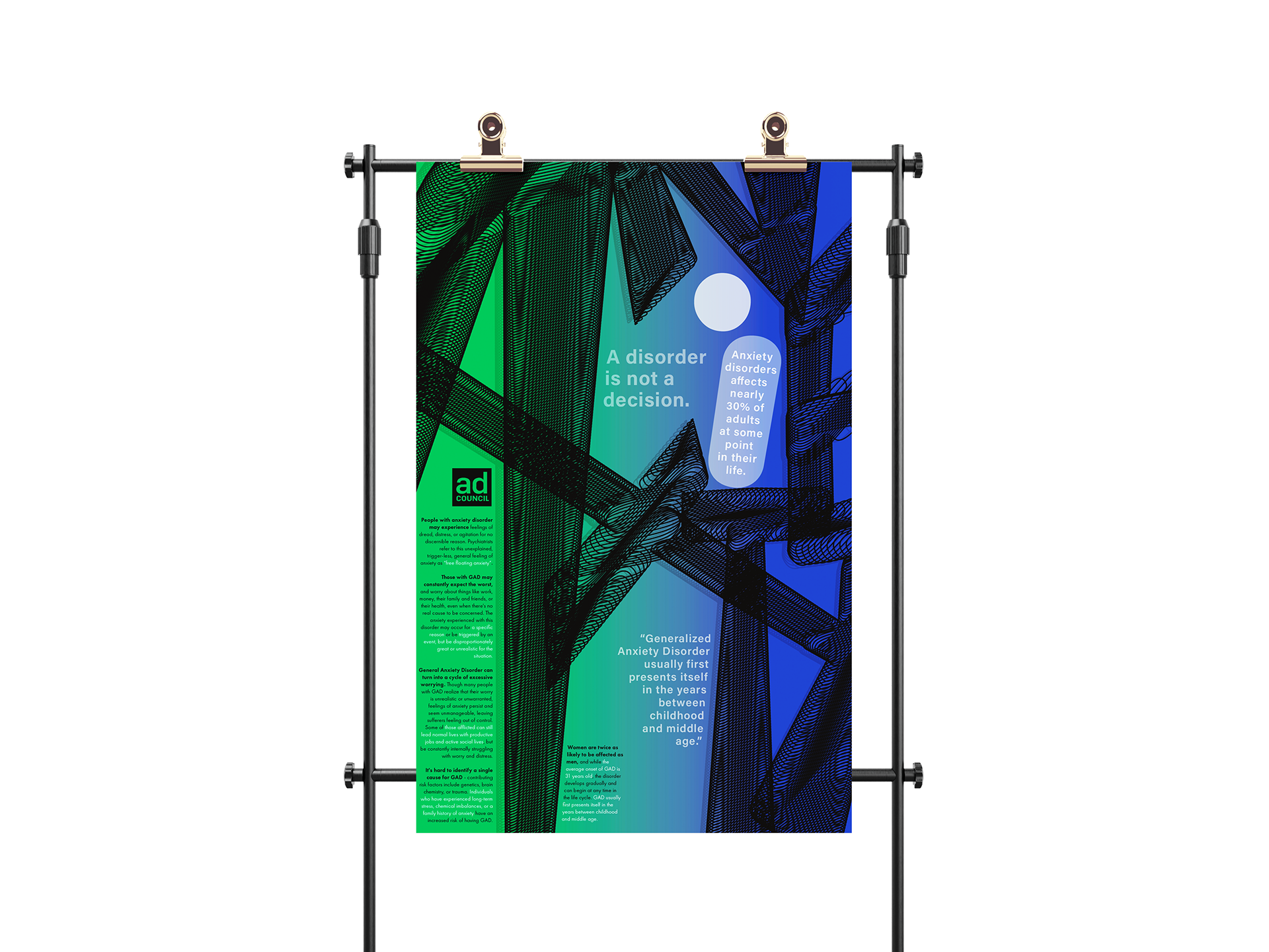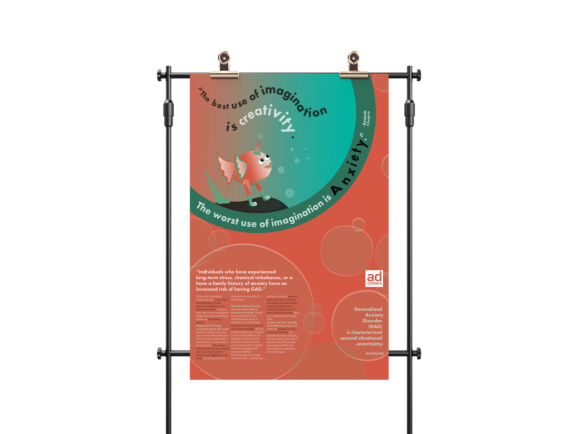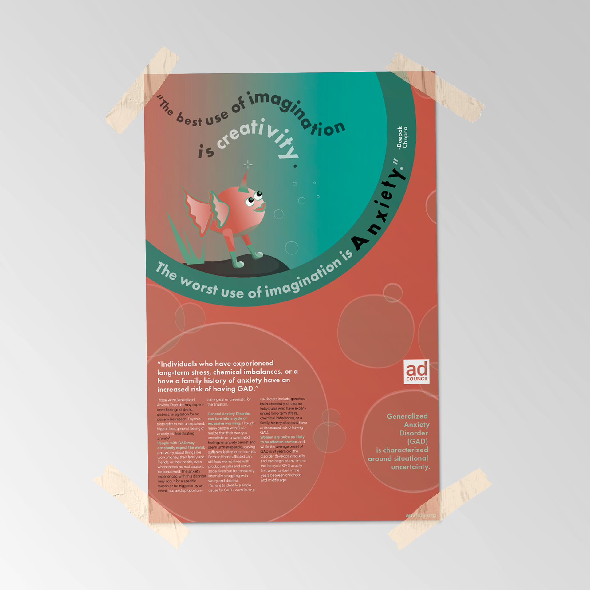 The direction was to design two posters (one text and image, one text only) for the AD Council to bring awareness to any topic of our choosing. The topic I selected was Generalized Anxiety Disorder.