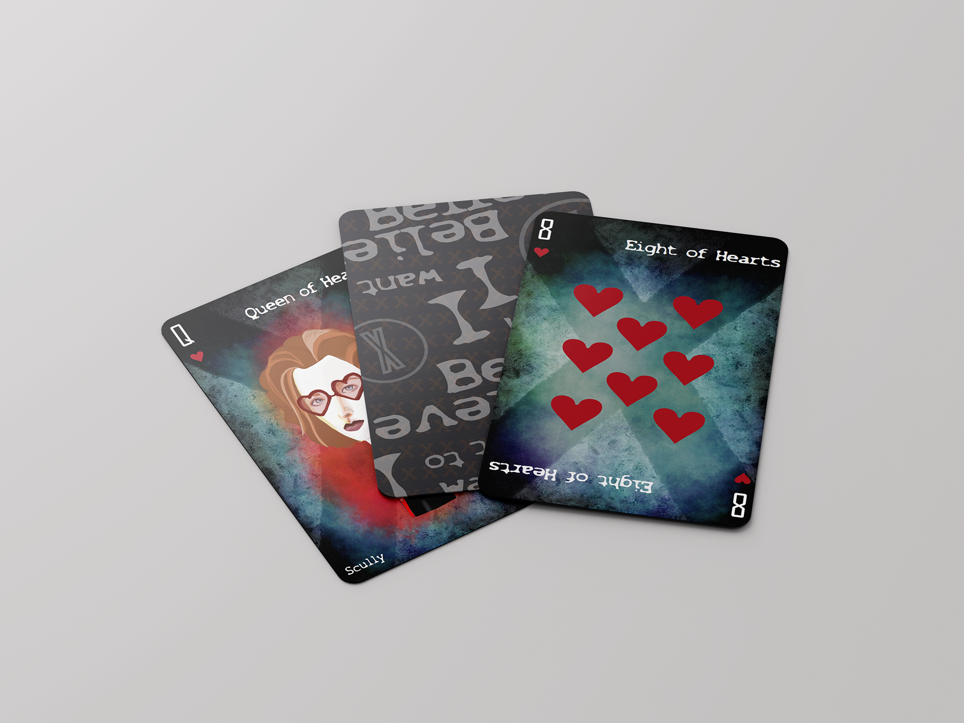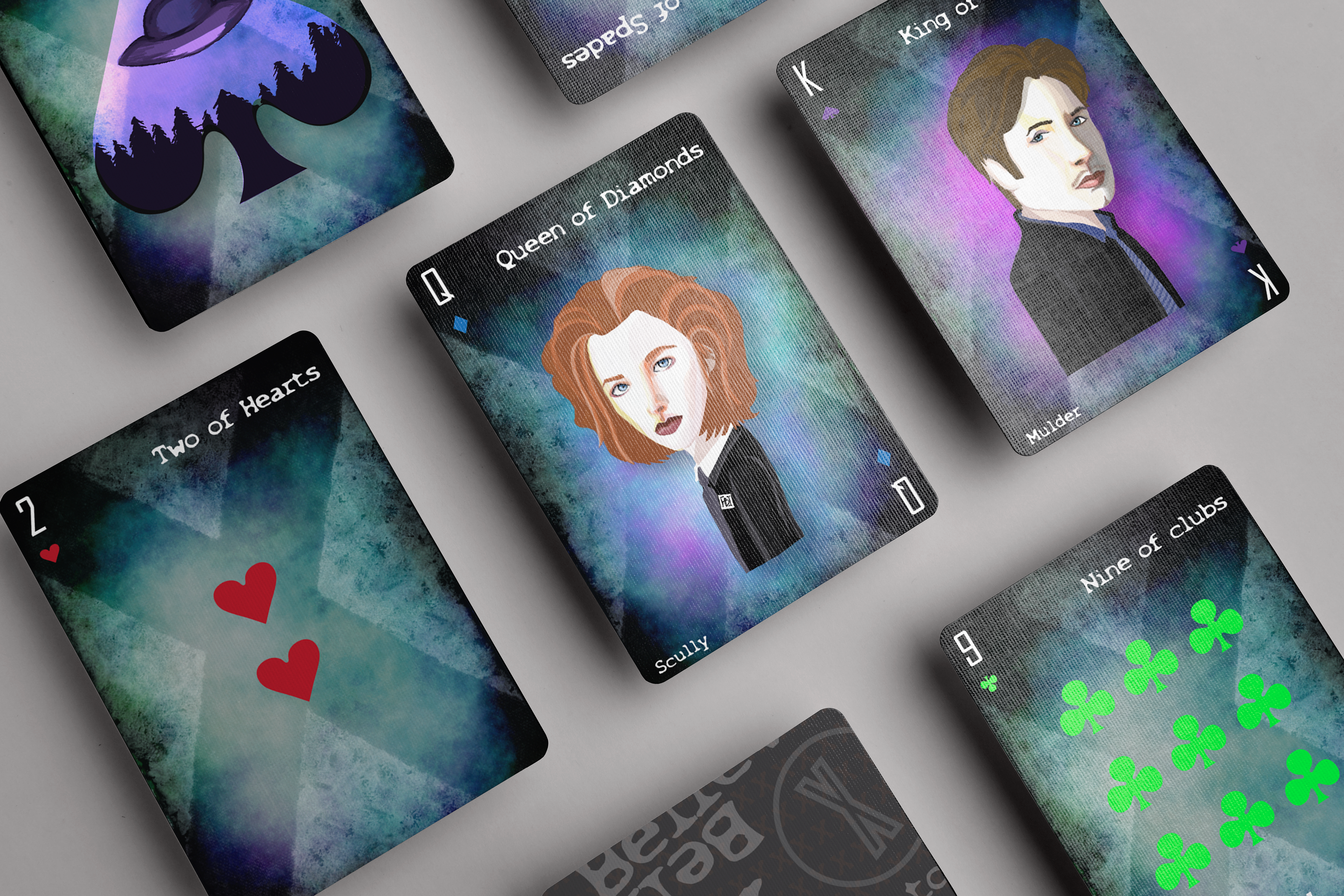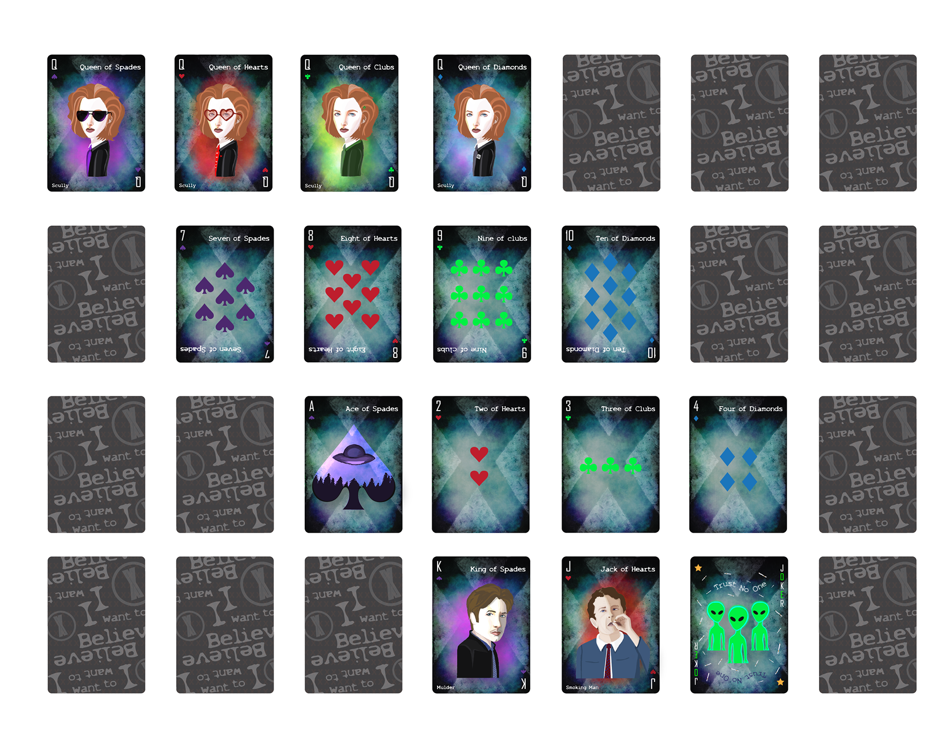 Illustrated poker cards inspired by the 1993 TV series "X-Files". If you're into fictional media and paranormal cases, these cards might also *suit* you.